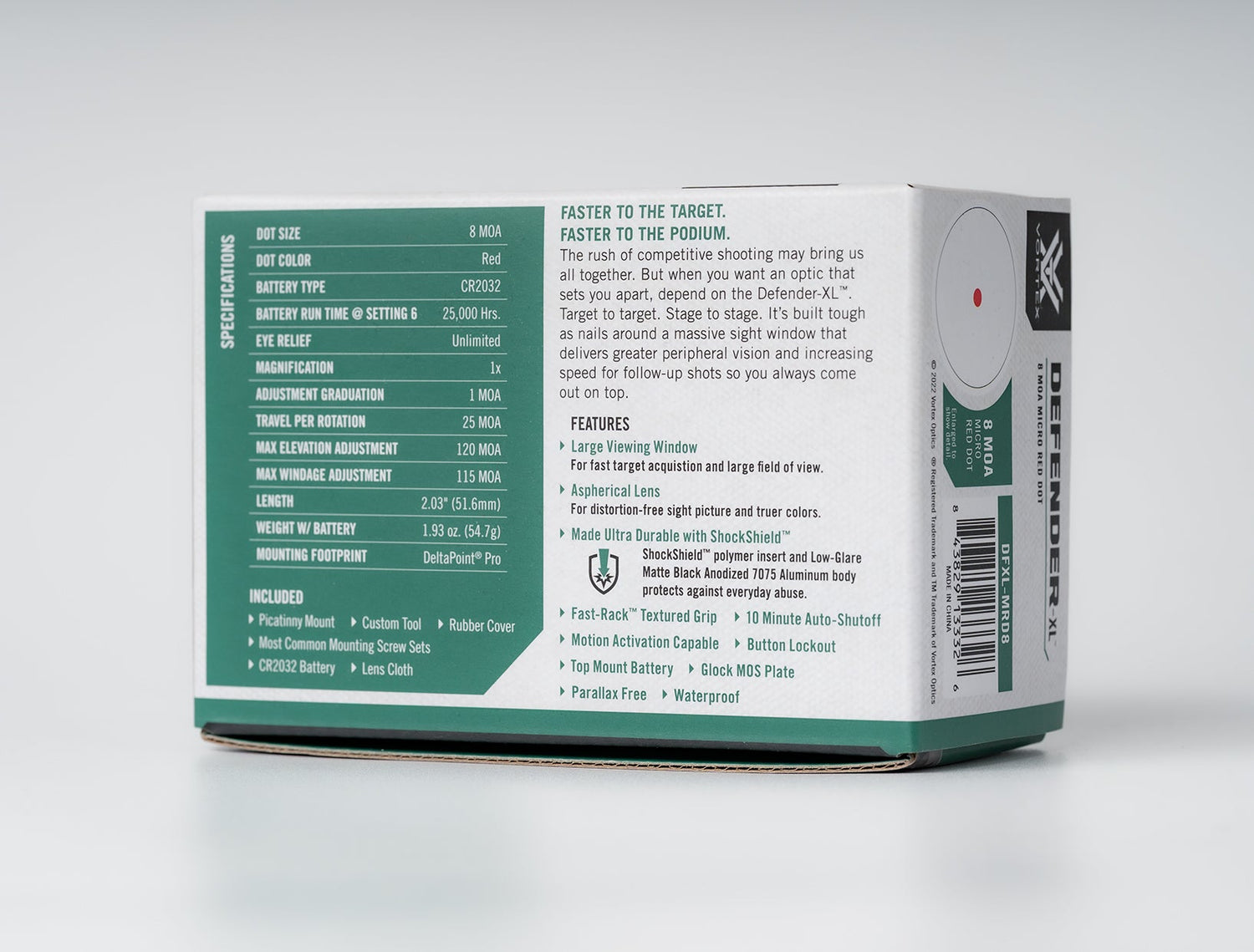 Σχεδιασμένο γύρω από ένα υπερ-ευρύ παράθυρο σκόπευσης για ταχύτερες μεταβάσεις στόχου, το Defender-XL είναι ένα ανθεκτικό, κατάλληλο για αγώνες micro σκοπευτικό κόκκινης κουκκίδας που λειτουργεί εξαιρετικά και σε υπηρεσιακά ή σκοπευτικά πιστόλια—και σε καραμπίνες/καραμπίνες όταν χρησιμοποιείται με τη συμπεριλαμβανόμενη βάση για ράγα Picatinny.